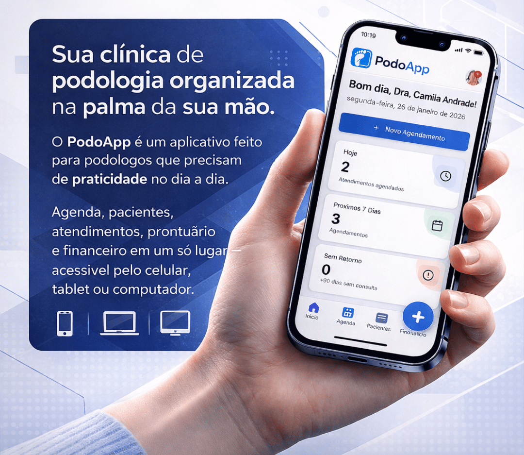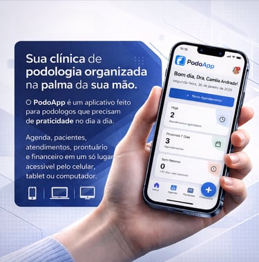 “O PodoApp é um Aplicativo, um sistema de gestão completo criado exclusivamente para podólogos. Ele centraliza sua agenda, pacientes, atendimentos e financeiro em um único lugar, de forma simples e intuitiva, podendo ser usado em Tablet, Celular ou Notebook.